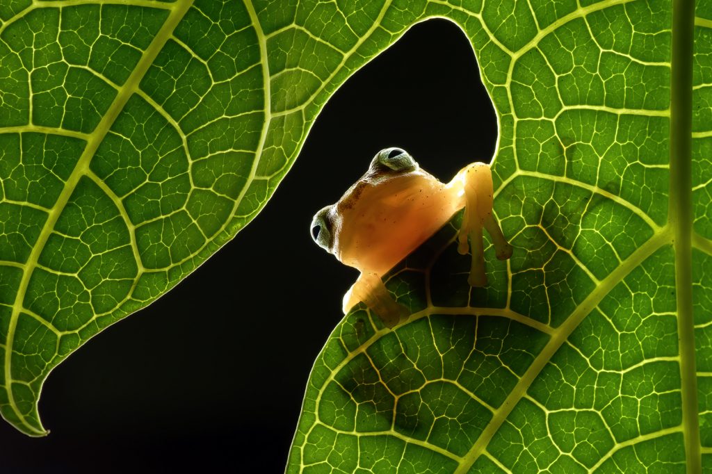 Description: A glass frog with a very small size and almost transparent body, was peeking among the leaves