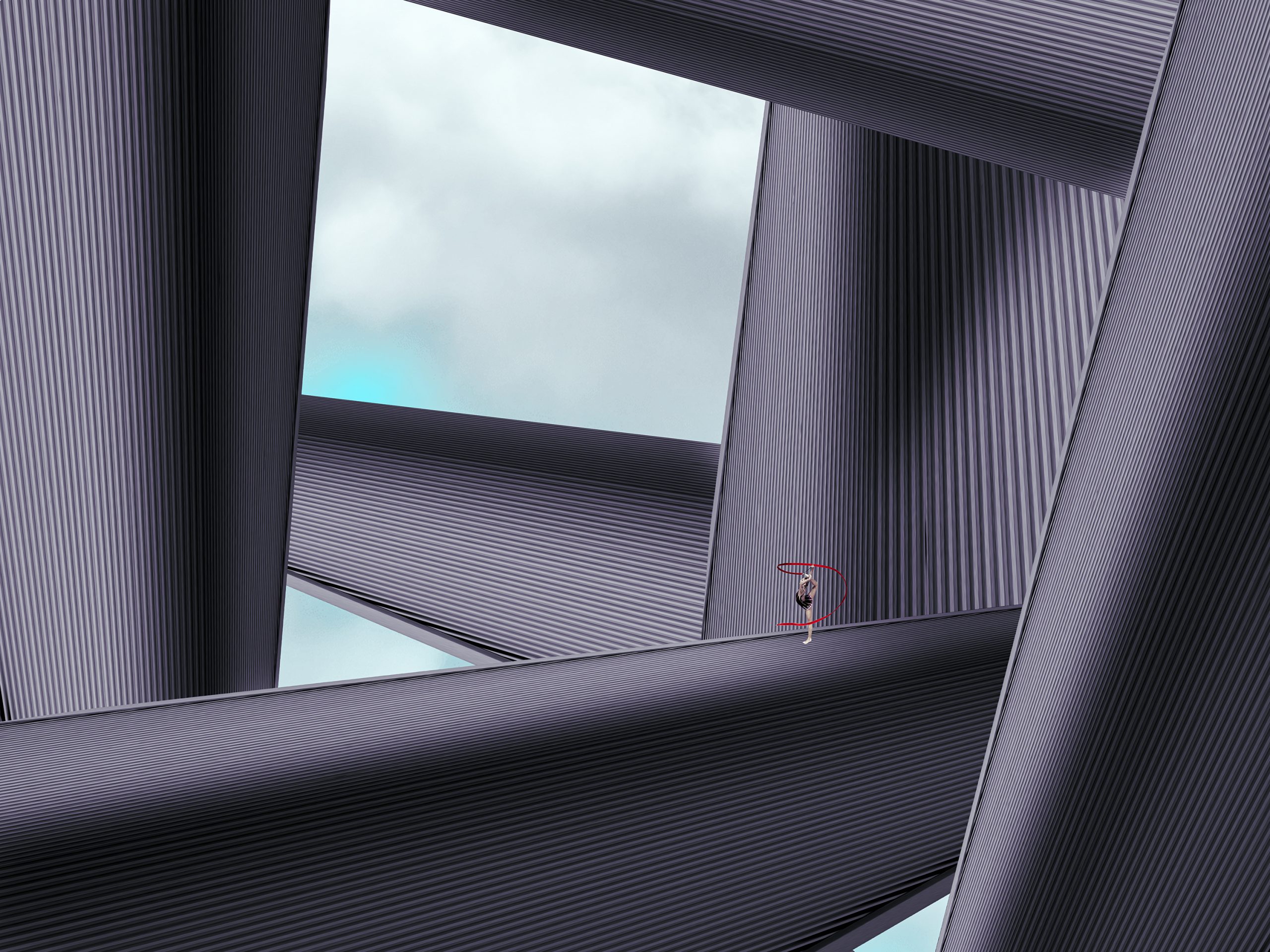 Description: Lines ripple and intertwine, forming rigid patterns of solid geometry. A lone figure moves within them dancing, leaping, balancing on the edge. They respond to the space, follow its lead, but resist its limits. Then, something shifts. The lines open, not break. Movement transforms the structure; what once confined becomes a path. With one step, space turns into story, no longer a cage, but a rhythm unfolding with each breath.