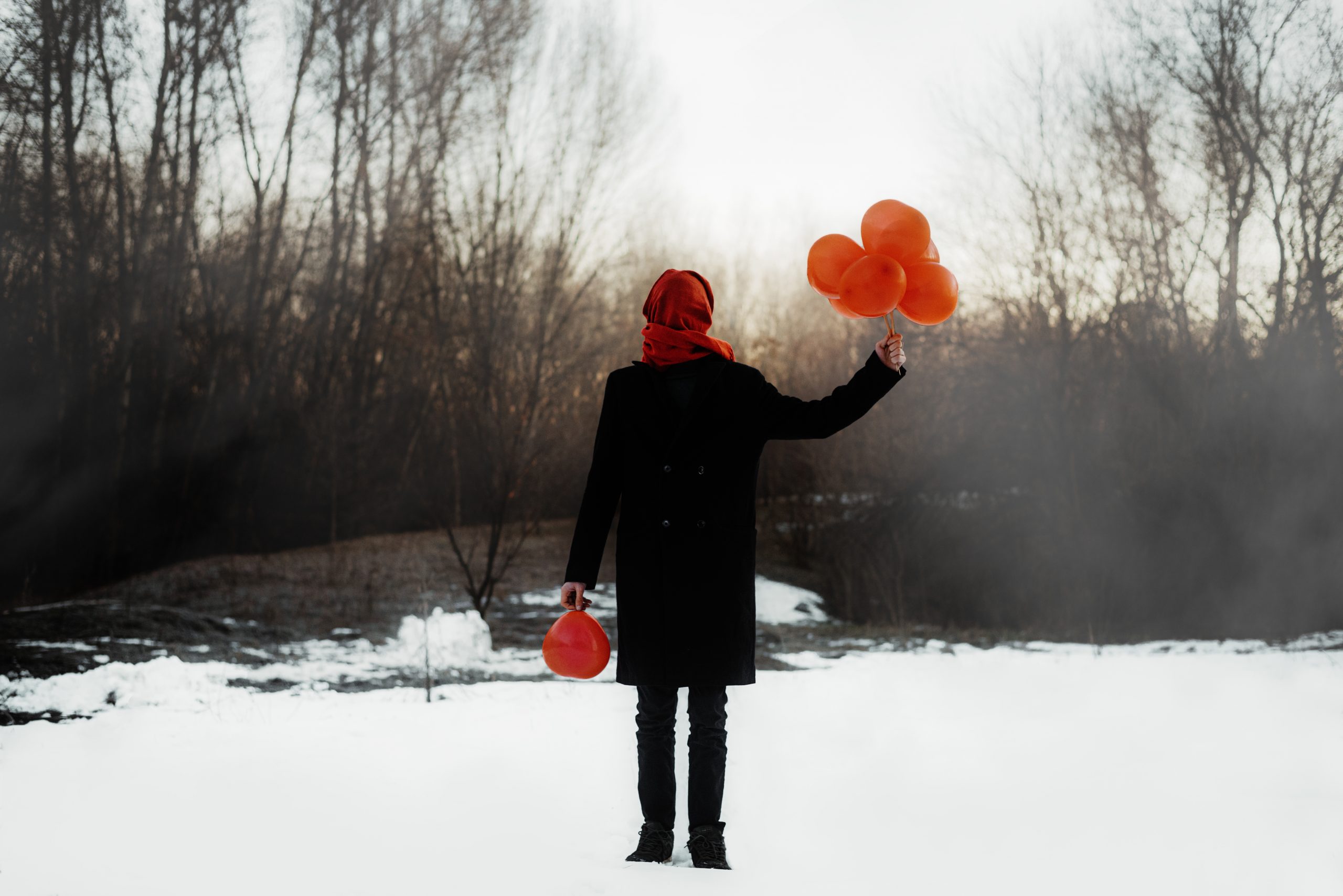 Description: The balloons represent the childhood, the man with the scarf in the face represent all the things we refuse to see - traumas from our childhood that hold us back.