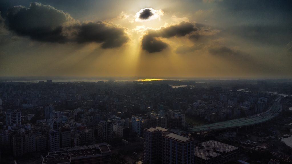 - Description: This stunning aerial image captures a dramatic sunset over a densely populated urban landscape, likely Dhaka, Bangladesh. The city is sprawling below in intricate patterns of mid-rise buildings and high-rises, with a long elevated road or expressway curving through the right side of the frame.