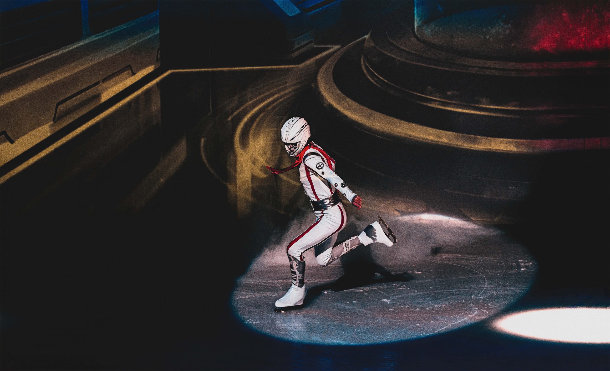 Description: This captivating image showcases a figure skater mid-performance, illuminated by a dramatic spotlight against a futuristic backdrop. The athlete's dynamic pose and sleek costume highlight strength and elegance. Captured in a burst of motion, the photograph blends sport with artistry, emphasising precision and balance. A stunning tribute to the dedication and skill of figure skating, this image captures the thrill of competition in a mesmerising light.