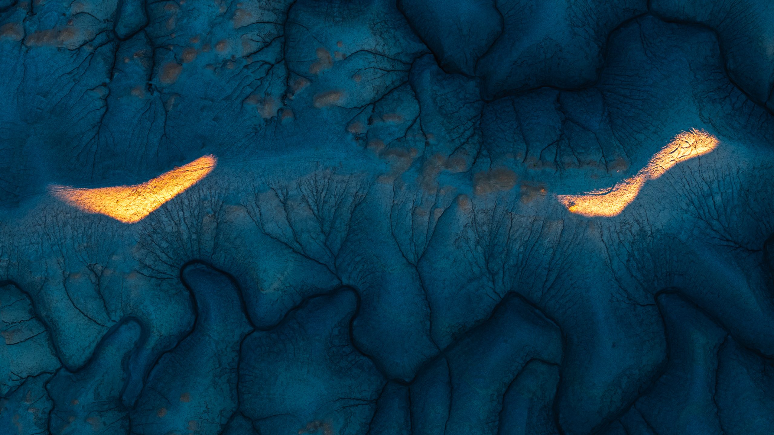 Description: This photograph below captures the eroded textures and unique geological formations of Utah’s deserts, showcasing the mesmerizing beauty of places like the Badlands, Canyonlands, or Escalante. The interplay of deep blue tones and glowing orange highlights illustrates the incredible power of light. As sunlight grazes the surface at just the right angle—likely during the golden hours—it transforms the rugged terrain into an evocative masterpiece.