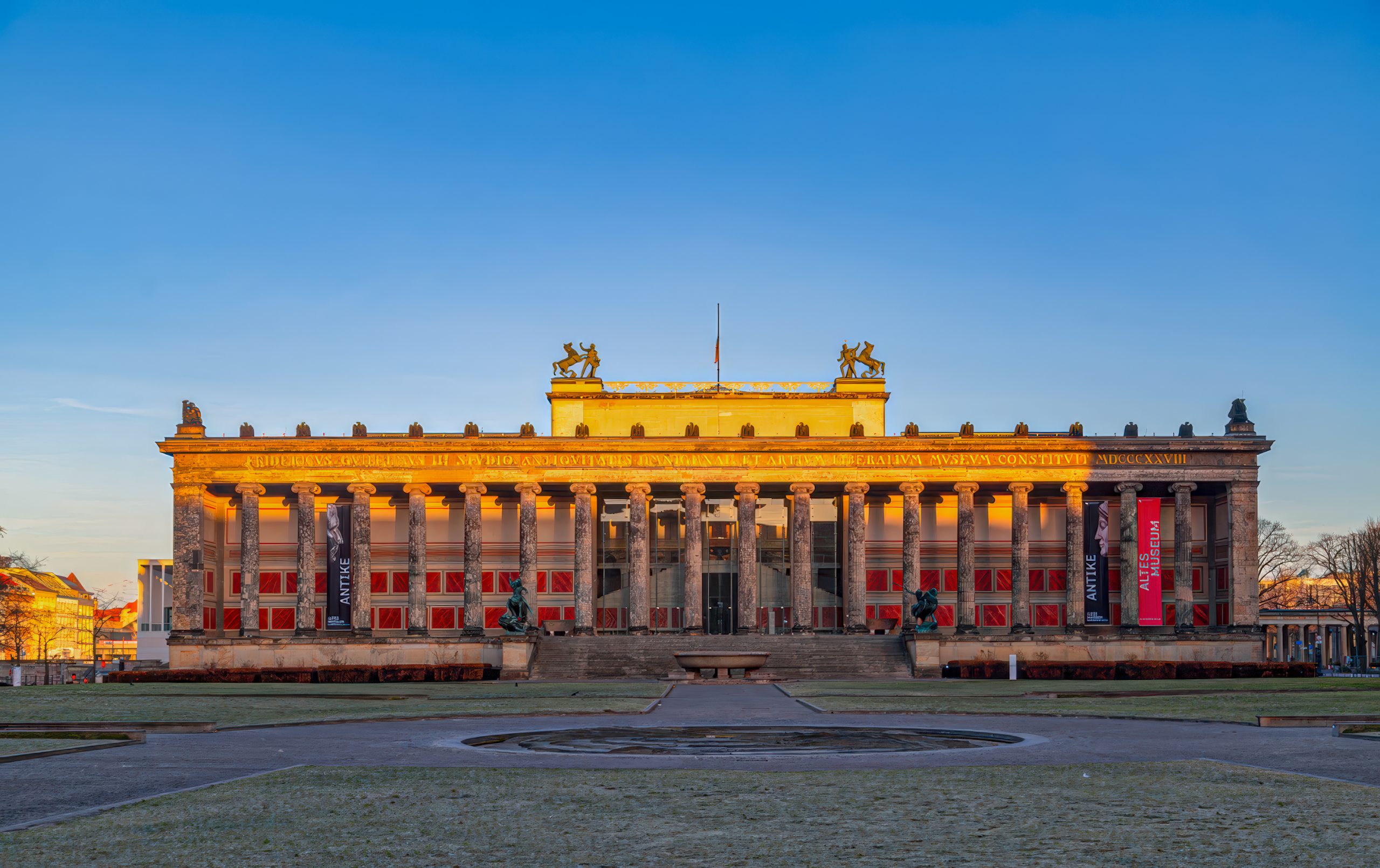 Description: The ancient building is illuminated by the winter morning sun and is golden.