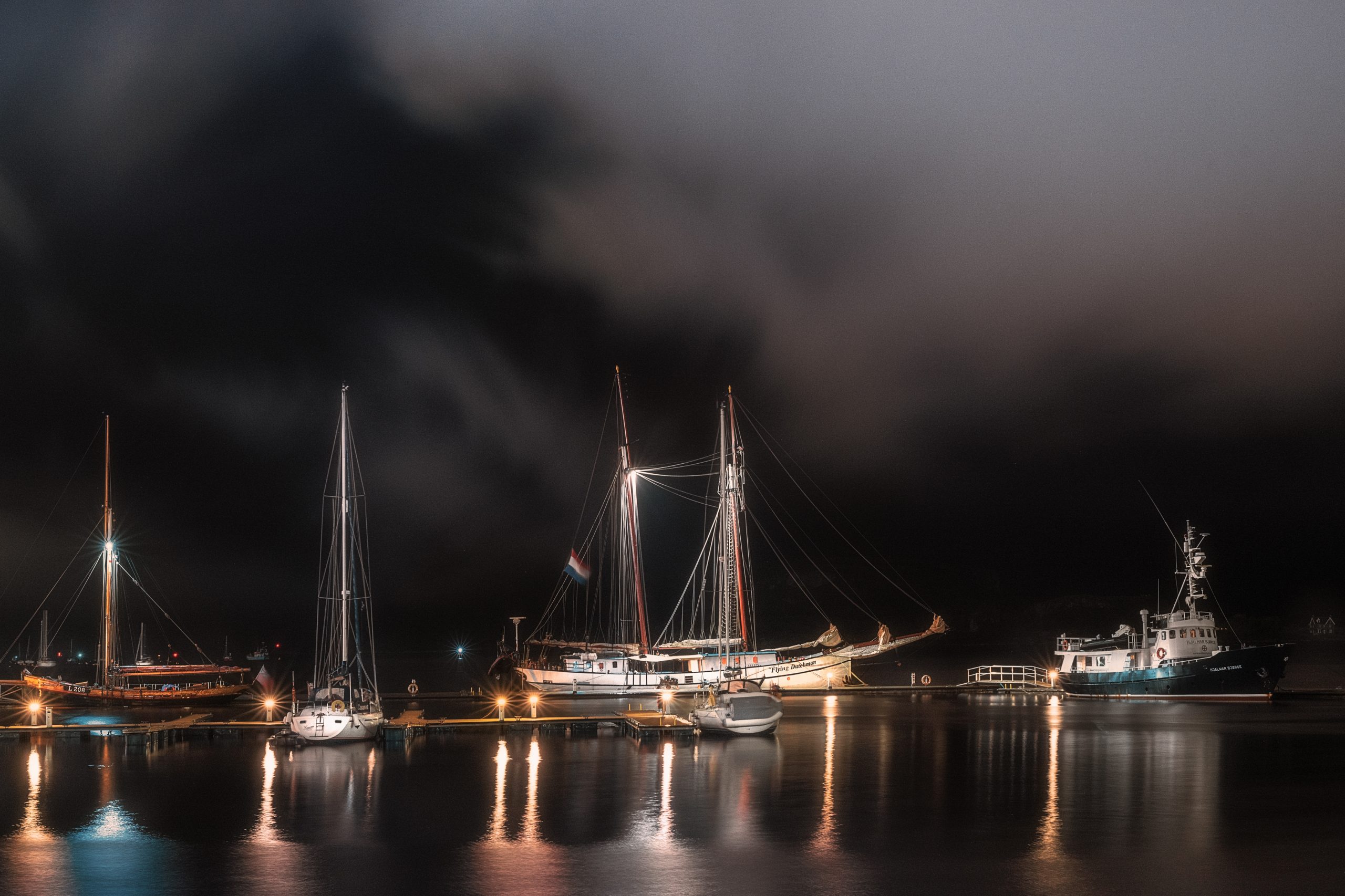 Description: La foto e` stata scattata nel porto di Oban in Scozia in Ottobre 2024, le barche riposano sotto un cielo notturno carico di nuvole. Le luci soffuse riflettono sull’acqua calma, creando un’atmosfera suggestiva. Spicca una goletta con bandiera olandese, segno di viaggio o storia. Un piccolo natante in primo piano, quasi inosservato, richiama l’attenzione sul contrasto tra grandezza e solitudine, invitando a riflettere sul senso del viaggio.