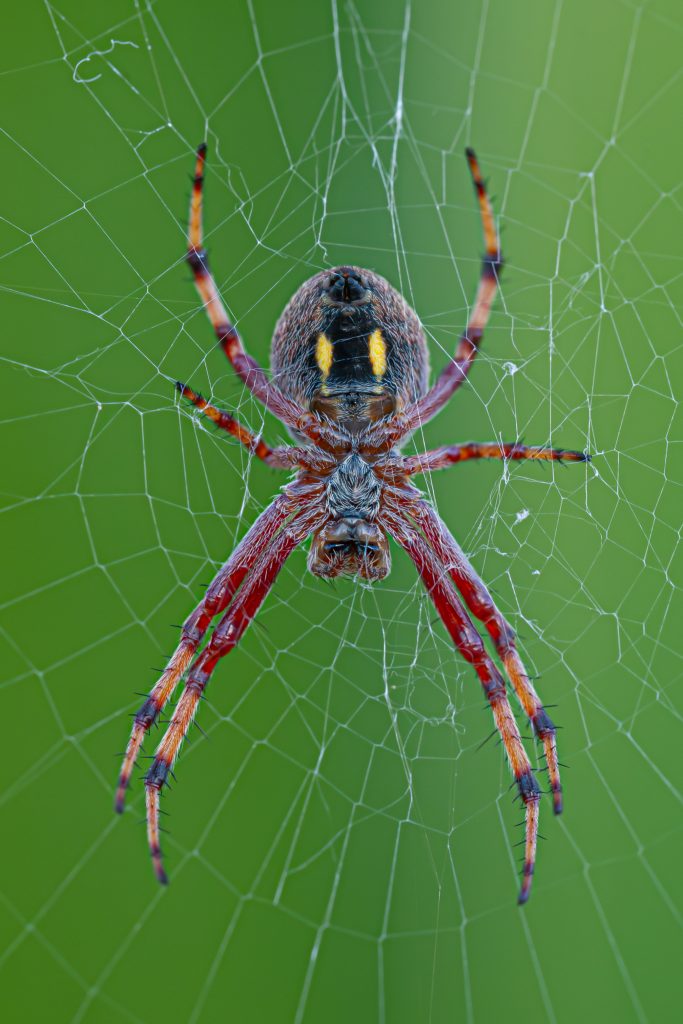 Description: A bright red orb weaver spider (Salsa fuliginata), found in Eastern Australia, waits in its web.