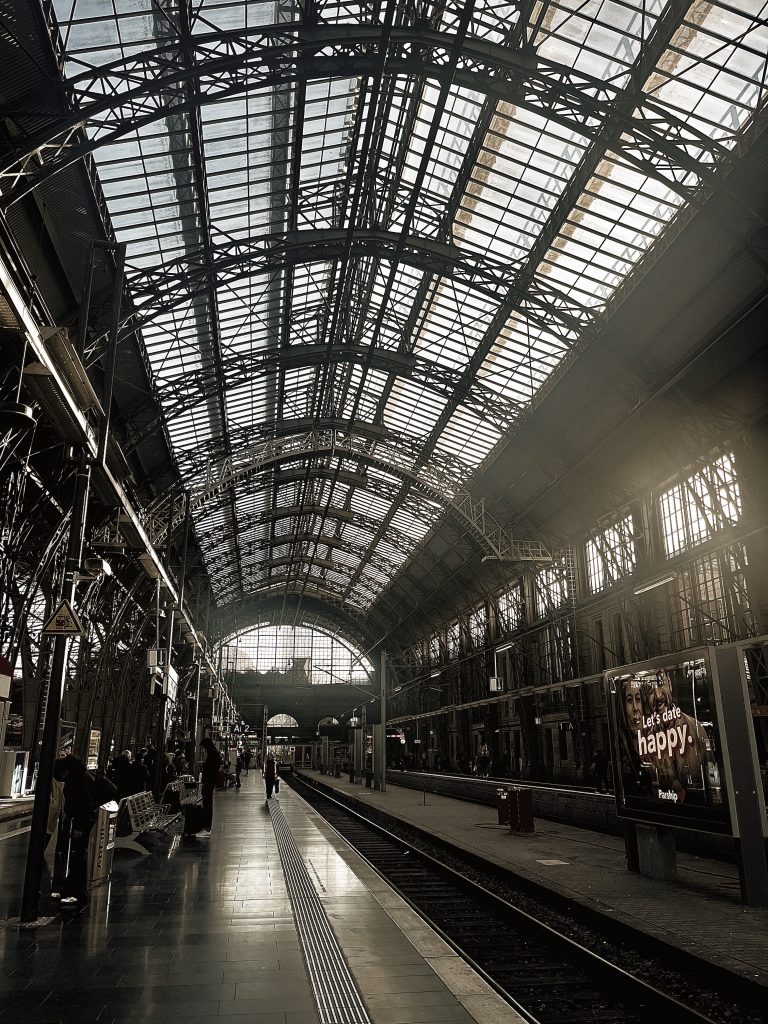 - Description: The central station in Frankfurt am Main — a cathedral of steel and glass, where light, movement, and anticipation meet. This architectural marvel captures the poetry of departure and arrival, of solitude and connection. The billboard whispering “Let’s date happy” adds a human irony to the grand, industrial scene.