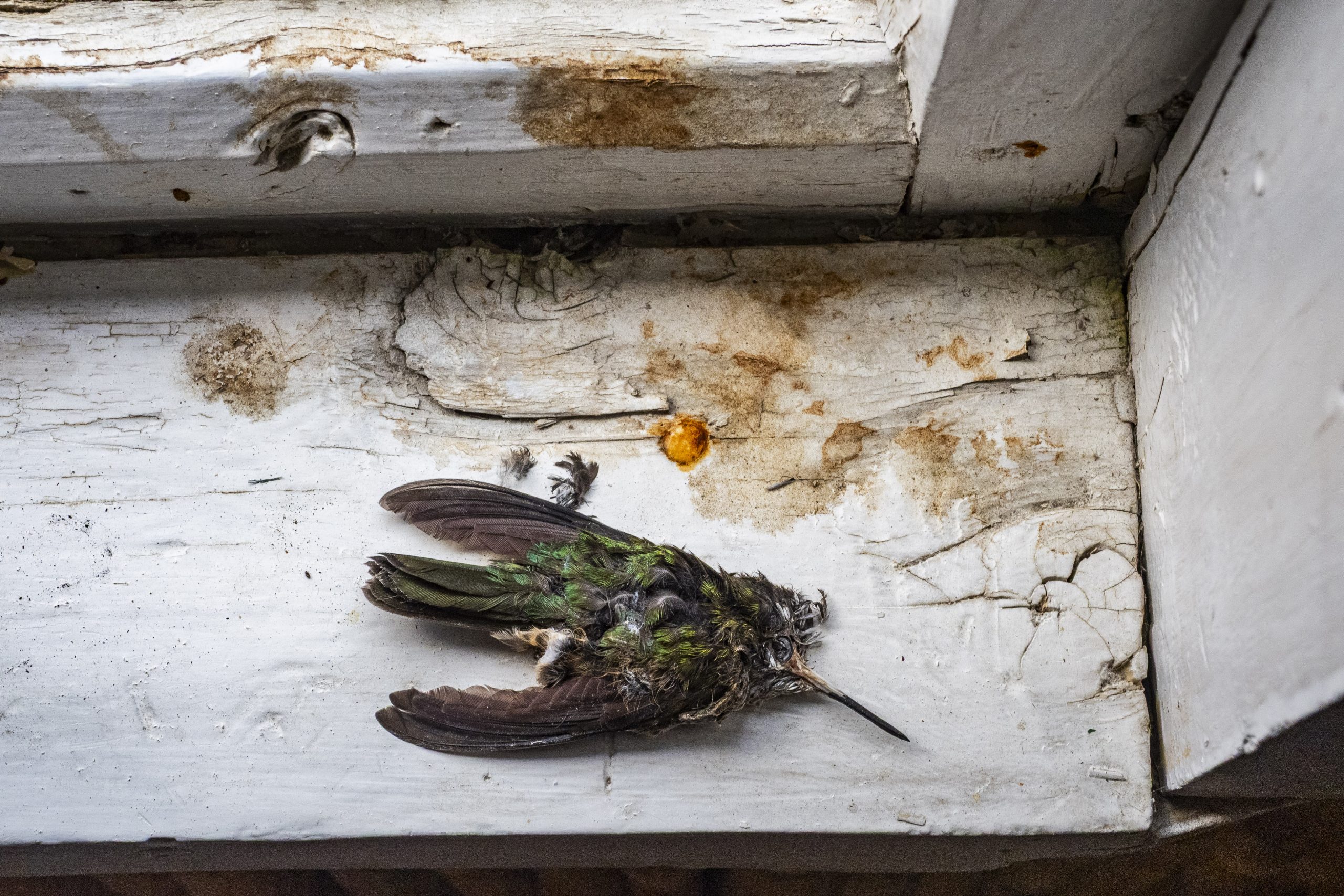 Description: A Green-backed firecrown (Sephanoides sephaniodes) remains dead in a window sill. It entered in this little church, but it probably doesn't find the exit way