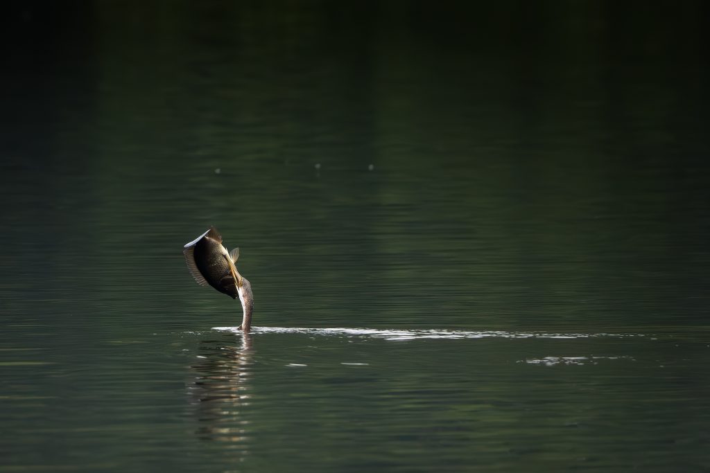 Description: A cormorant snake is catching a fish in a mangrove lake