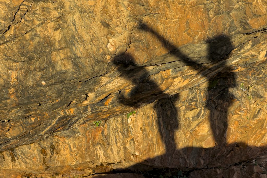 - Description: My wife and me were visiting an ancient cave with ancient rock art, on the last hour of the day. She was looking for ancient paints while I was pointing her another place. When I look to my right hand, I see our deformed shadows in the cliff on a comic way. This occurred because the rock wall is crossed on the middle by on horizontal strait, slightly noticeable.