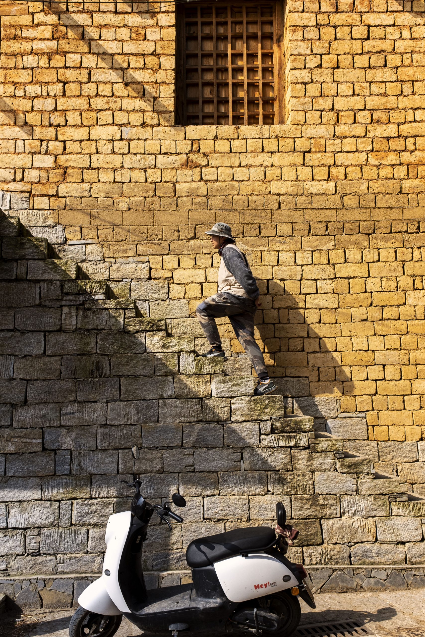 Description: A man climbs a narrow staircase along a sunlit wall, his shadow rising with him. There is no destination in sight, only the rhythm of steps, light, and the will to keep going.