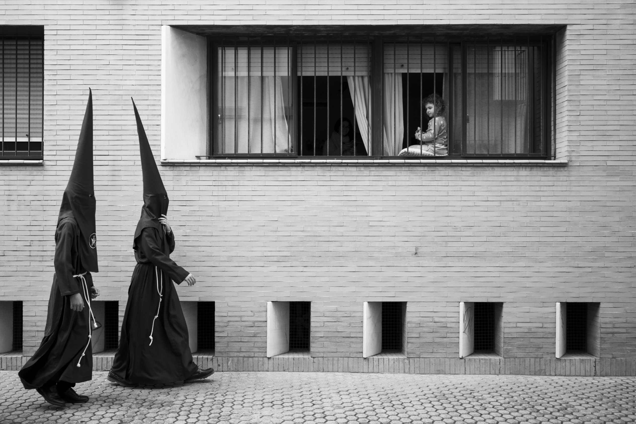 I had always wanted to go to Seville for Semana Santa and finally managed to this year. In this photo, I first saw the girl on the window and then the nazarenos coming by. Luckily, my camera was ready to take the shot.