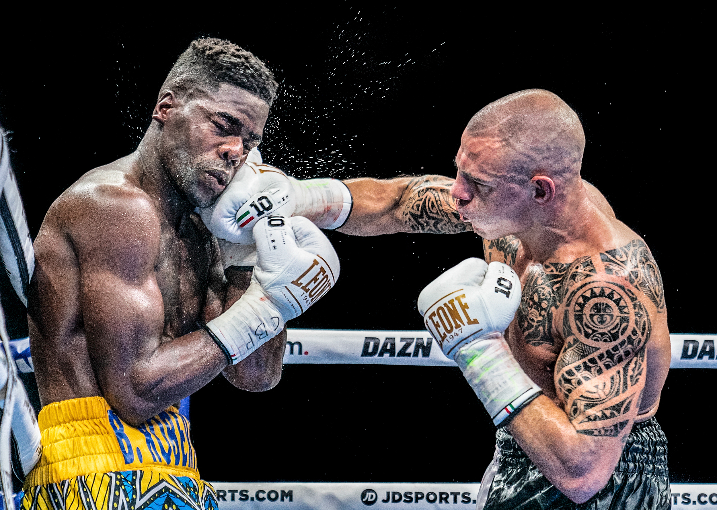 The Boxer from Vizcaya Spain connects a spectacular straight punch to his rival Damian Biacho at the Bilbao Arena